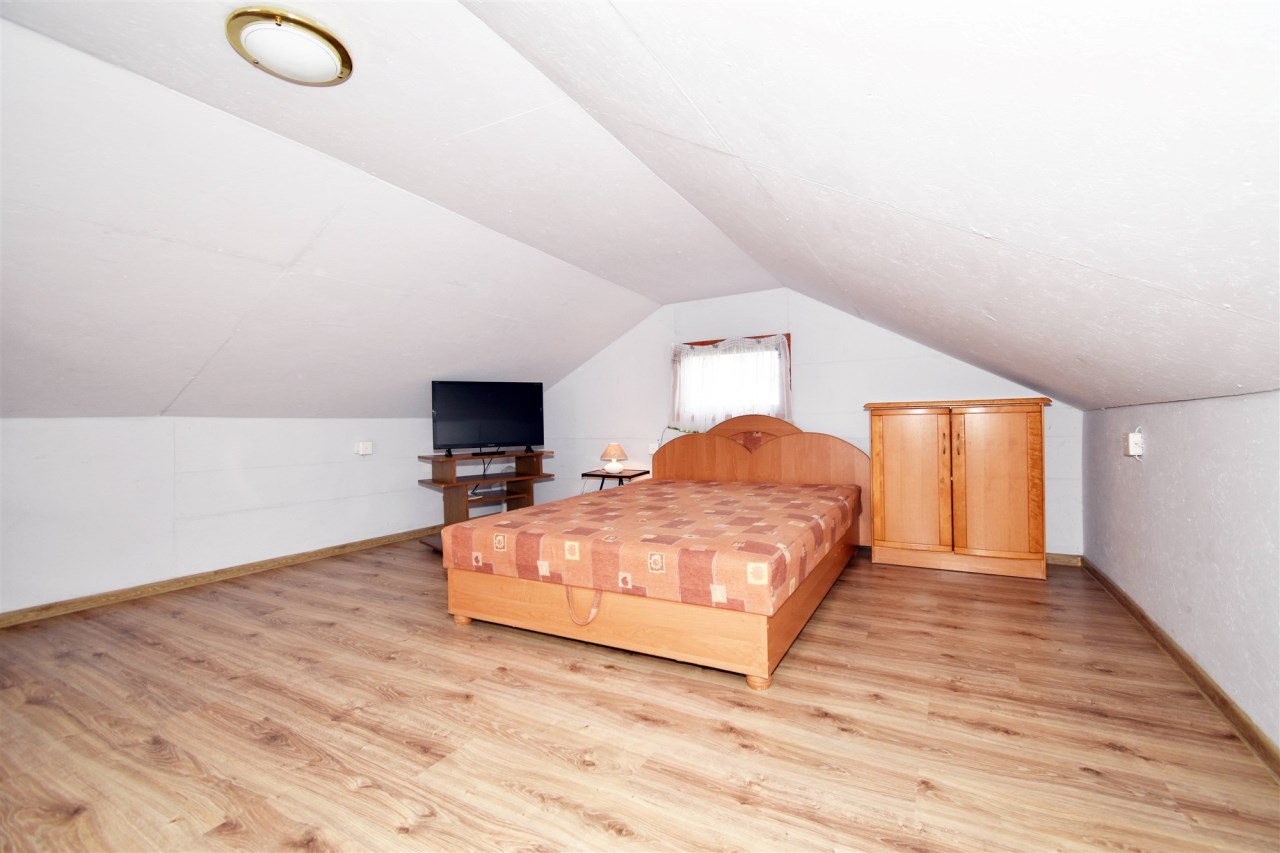 - domek drewniany, parterowy z poddaszem, kryty blachą, okna PCV, drewniane schody