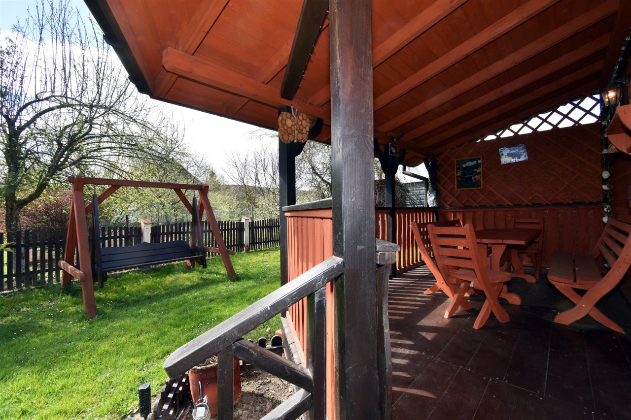 - mała architektura ogrodowa: drewniana huśtawka, drewutnia, ławeczka z pergolą, przygotowane miejsce na ognisko